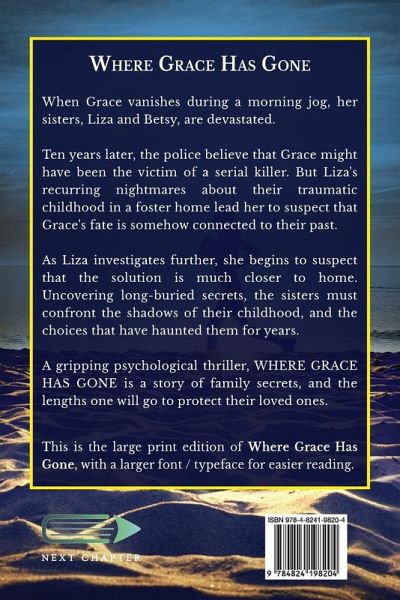 When Grace vanishes during a morning jog, her sisters, Liza and Betsy, are devastated. Ten years later, the police believe that Grace might have been the victim of a serial killer. But Liza's recurring nightmares about their traumatic childhood in a foster home lead her to suspect that Grace's fate is somehow connected to their past. As Liza investigates further, she begins to suspect that the solution is much closer to home. Uncovering long-buried secrets, the sisters must confront the shadows of their childhood, and the choices that have haunted them for years. A gripping psychological thriller, WHERE GRACE HAS GONE is a story of family secrets, and the lengths one will go to protect their loved ones. This is the large print edition of Where Grace Has Gone, with a larger font / typeface for easier reading.