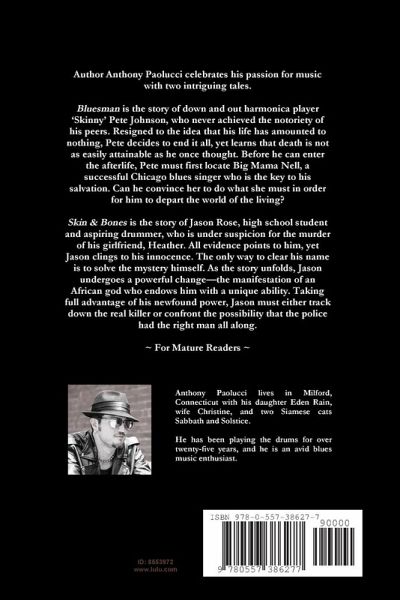 Bluesman is the story of Skinny Pete Johnson, who never achieved the notoriety of his peers. Resigned to the idea that his life has amounted to nothing, Pete decides to end it all, yet learns that death is not as easily attainable as he once thought. Before he can enter the afterlife, Pete must locate Big Mama Nell, a Chicago blues singer who is the key to his salvation. Can he convince her to do what she must in order for him to depart the world of the living? Skin & Bones is the story of Jason Rose, high school student and drummer, who is under suspicion for murder. All evidence points to him, yet Jason clings to his innocence. The only way to clear his name is to solve the mystery himself. As the story unfolds, Jason undergoes a powerful change-the manifestation of an African god who endows him with a unique ability. Taking full advantage of his newfound power, Jason must either track down the real killer or confront the possibility that the police had the right man all along. * For mature readers