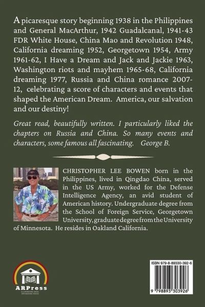 A picaresque story beginning 1938 in the Philippines and General MacArthur, 1942 Guadalcanal, 1941-43 FDR White House, China Mao and Revolution 1948, California dreaming 1952, Georgetown 1954, Army 1961-62, I Have a Dream and Jack and Jackie 1963, Washington riots and mayhem 1965-68, California dreaming 1977, Russia and China romance 2007-12, celebrating a score of characters and events that shaped the American Dream. America, our salvation and our destiny! Great read, beautifully written. I particularly liked the chapters on Russia and China. So many events and characters, some famous all fascinating. George B.