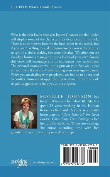 Are you one of the good leaders? You will find value in this book whether you are the leader of your family, a community club or a giant corporation. Ms. Johnson shares delightful personal foster care parenting events in conjunction with over 25 years of human resources experiences in this self-help leadership support book. No one is born a good leader. Good leadership traits are learned through a positive willingness to make improvements. If one does not learn the qualities of a good leader than the poor leadership characteristics will be repeated. Not only will this book provide valuable recruiting and retention strategies but it will also encourage you to become a future square dance caller.