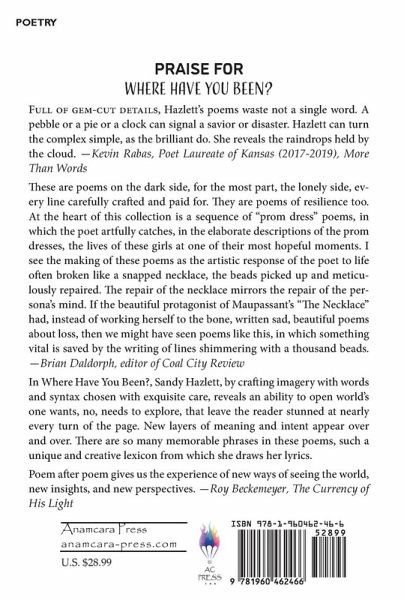 Sandy Hazlett is originally from Pittsburgh, Pennsylvania where she was surrounded by poets and poetry. When she was in Middle School, her father, Theodore Lyle Hazlett Jr., and Dr. Samuel Hazo started the International Poetry Forum. She has been writing since childhood but she began writing with greater intent and study in 1992 when she moved to Lawrence, Kansas. Where Have You Been? is a selection of poems from that time.