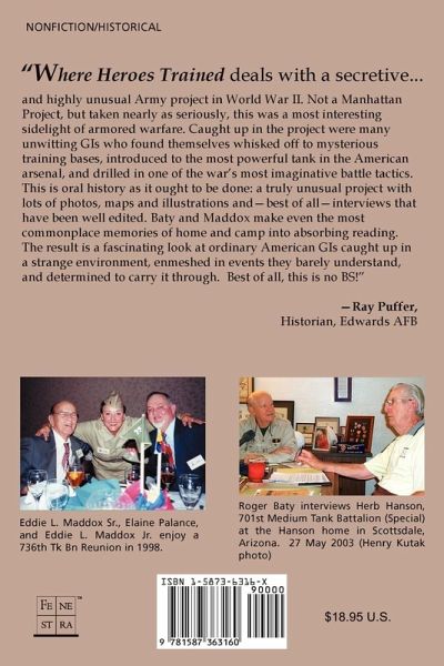 "Where Heroes Trained deals with a secretive and highly unusual Army project in World War II. Not a Manhattan Project, but taken nearly as seriously, this was a most interesting sidelight of armored warfare. Caught up in the project were many unwitting GIs who found themselves whisked off to mysterious training bases, introduced to the most powerful tank in the American arsenal, and drilled in one of the war's most imaginative battle tactics. This is oral history as it ought to be done: a truly unusual project with lots of photos, maps and illustrations and-best of all-interviews that have been well edited. Baty and Maddox make even the most commonplace memories of home and camp into absorbing reading. The result is a fascinating look at ordinary American GIs caught up in a strange environment, enmeshed in events they barely understand, and determined to carry it through. Best of all, this is no BS!" -Ray Puffer, Historian, Edwards AFB