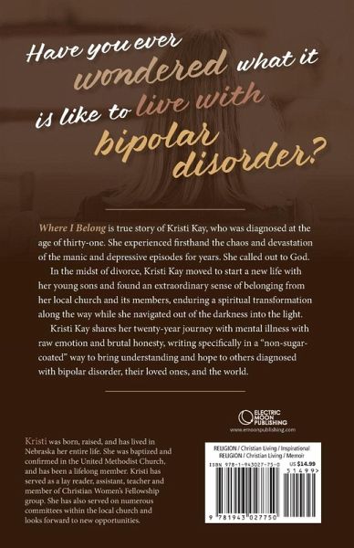 Where I Belong is the story of a woman with mental illness fed by chronic low self-esteem. Falling away from God after being diagnosed with Bipolar Disorder at the age of 31, the woman finds her way back to Him for healing, and her true place in the world. She realizes the only way to live with illness was with God. This truth enables her to ultimately accept herself just as she is.