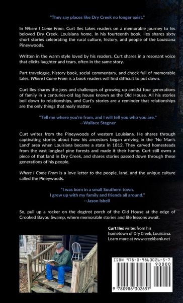 "They say places like Dry Creek no longer exist." In Where I Come From, Curt Iles takes readers on a memorable journey to his beloved Dry Creek, Louisiana home. In his fourteenth book, Iles shares over sixty short stories celebrating the rural culture, history, and people of the Louisiana Pineywoods. Written in the warm style loved by his readers, Curt writes in a resonant voice that elicits laughter and tears, often in the same story. Part travelogue, history book, social commentary, and chock full of memorable tales, Where I Come From is a book readers will find difficult to put down. No matter where these stories start, they invariably end up/return to his beloved Dry Creek home. "I'm from the Pineywoods of western Louisiana. My ancestors began arriving in the 'No Man's Land' area when Louisiana became a state in 1812. They carved homesteads from the vast longleaf pine forests and made it their home. I still own some of that land in Dry Creek, and my calling is to share stories passed down through these generations. "I'm just as interested in today's Pineywoods and its cast of memorable characters and heartwarming stories. "Where I Come From is about a love of the land, respect for history, and stories about a unique culture I love. "It's my love letter to the land I call home. It's where I come from." Curt Iles shares the joys and challenges of growing up amidst four generations of family in a centuries-old log house known as The Old House. All his stories boil down to relationships, and Curt's stories are a reminder that relationships are the only things that really matter. Pull up a rocker on the dogtrot porch of The Old House at the edge of Crooked Bayou Swamp, where memorable stories and life lessons await.