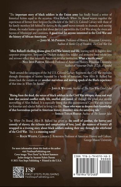 Where I'm Bound, a stunning and engaging Civil War novel, was the first novel (Simon & Schuster 2000) to focus solely on the soldiers of an African American regiment. Throughout the war, more than 180,000 African-American men fought for the Union Army. Many were escaped slaves, others were freed men; yet all voluntarily enlisted for one cause: freedom. These experiences are successfully portrayed in a manner befitting the grandeur and scope of their contributions. Inspired by the true story of a black cavalry unit in Mississippi, renowned African-American historian Allen Ballard weaves factual events with the fictional account of an escaped slave, Joe Duckett, who flees to join the Northern Army. When Duckett escapes his life of bondage to become a cavalry scout, he grows to be more than a free man-he becomes a hero. Duckett and his hard-riding regiment roam the Mississippi Delta, freeing slaves and keeping vital waterways open for the Union. As the war approaches its final, tragic days, Duckett embarks on his most dangerous mission yet: to return to the plantation from which he escaped in order to reunite with his wife and daughter. More than just an account of Civil War, Where I'm Bound is an affecting portrayal of the psychological effects of war. Through the character Duckett, some of war's greatest tragedies are painfully evoked-the agonizing separation from family, the horrendous mission of having to kill another man, and the cruelty and moral corruption that occur when men's passions are their greatest weapons against one another. This story of one man's ability to meet such overwhelming challenges brings to life the noble fight for freedom as displayed by African-American soldiers as well as the effects of the fight on an entire country and culture. Where I'm Bound is a striking blend of historical fact and dramatic storytelling brilliantly illustrating the accomplishments of African-American Civil War soldiers. Where I'm Bound is destined to become a classic novel of the Civil War.