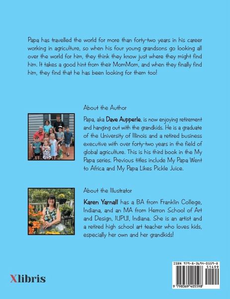 Papa has travelled the world for more than forty-two years in his career working in agriculture, so when his four young grandsons go looking all over the world for him, they think they know just where they might find him. It takes a good hint from their MomMom, and when they finally find him, they find that he has been looking for them too!