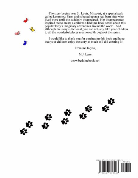 The story begins near St. Louis, Missouri, at a special park called Longview Farm and is based upon a real barn kitty who lived there until she suddenly disappeared. Her disappearance inspired the author to create a children's bedtime book series about this popular kitty's imaginary adventures around the world. And although the story is fictional, you can actually take your children to all the wonderful places mentioned throughout the series.