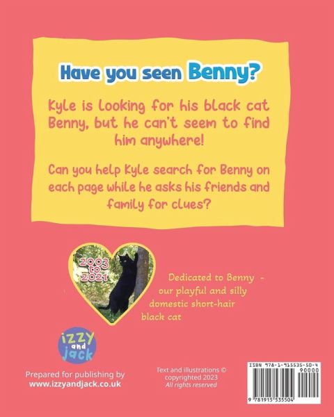 Can you help Kyle find Benny? A children's book about a sweet kitty named Benny who hides from the main character Kyle. Kids will delight in trying to find Benny and spot him doing something different on every page turn. Benny was the family cat for 18 years, he was a unique character and he is sorely missed.