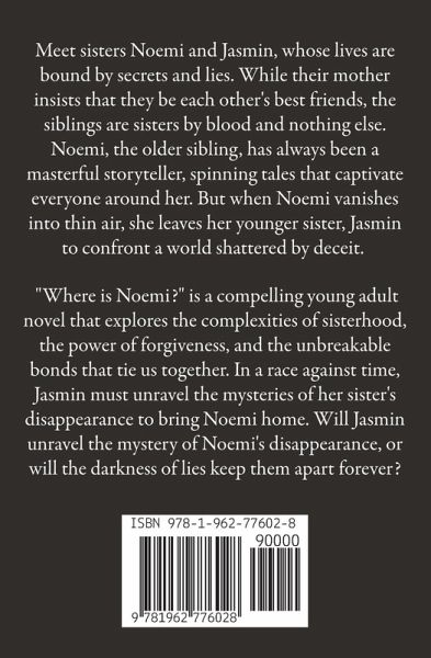 Meet sisters Noemi and Jasmin, whose lives are bound by secrets and lies. While their mother insists that they be each other's best friends, the siblings are sisters by blood and nothing else. Noemi, the older sibling, has always been a masterful storyteller, spinning tales that captivate everyone around her. But when Noemi vanishes into thin air, she leaves her younger sister, Jasmin to confront a world shattered by deceit. "Where is Noemi?" is a compelling young adult novel that explores the complexities of sisterhood, the power of forgiveness, and the unbreakable bonds that tie us together. In a race against time, Jasmin must unravel the mysteries of her sister's disappearance to bring Noemi home. Will Jasmin unravel the mystery of Noemi's disappearance, or will the darkness of lies keep them apart forever?