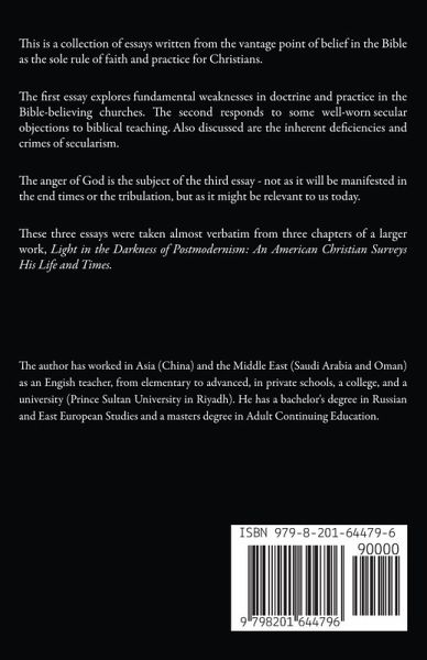 This is a collection of essays written from the vantage point of belief in the Bible as the sole rule of faith and practice for Christians. It does not attempt to prove the truth of the Bible, except incidentally, in response to specific secular criticisms. Rather, it presupposes that truth, and is hence primarily aimed at a Christian audience (though it is hoped that some on the opposing side will have an interest in responses in the 2nd essay to common criticisms of the Bible and of Christian faith). The essays do not have to be read in any particular order. The first essay ("The Gospel of Jesus Christ and the Christian Life") explores some fundamental weaknesses in doctrine and practice in the Bible-believing churches that prevent them from presenting the reality of Christ and from responding to secular challenges as well as they might. These include superficial concepts of repentance and faith, derived from superficial concepts of God's holiness and our sinfulness. The second ("The Decline of Christianity and the Oppositions of Radical Secularism") deals with some key points of secular opposition to biblical Christianity. This includes brief overviews of such topics as the massacres of the Canaanites; biblical slavery; the sacrifice of Isaac; the creation account in Genesis; and other relevant topics. Also discussed are the inherent deficiencies and crimes of secularism, along with a brief overview of Nietzsche's The Antichrist, his bitter attack on Christianity completed shortly before his collapse into insanity. The purpose is not to refute his work, but merely to expose it. The third ("The Wrath of God?") deals with the subject of God's sovereign anger, not as it will be manifested in the end times or the tribulation, but as it might be relevant to the United States today, in our present situation. Is America now as a nation coming under the direct judgment of God?