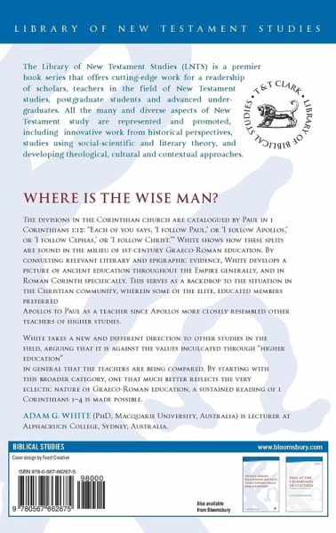 The divisions in the Corinthian church are catalogued by Paul in 1 Corinthians 1:12: "Each of you says, 'I follow Paul,' or 'I follow Apollos,' or 'I follow Cephas,' or 'I follow Christ.'" White shows how these splits are found in the milieu of 1st-century Graeco-Roman education. By consulting relevant literary and epigraphic evidence, White develops a picture of ancient education throughout the Empire generally, and in Roman Corinth specifically. This serves as a backdrop to the situation in the Christian community, wherein some of the elite, educated members preferred Apollos to Paul as a teacher since Apollos more closely resembled other teachers of higher studies. White takes a new and different direction to other studies in the field, arguing that it is against the values inculcated through "higher education" in general that the teachers are being compared. By starting with this broader category, one that much better reflects the very eclectic nature of Graeco-Roman education, a sustained reading of 1 Corinthians 1-4 is made possible.