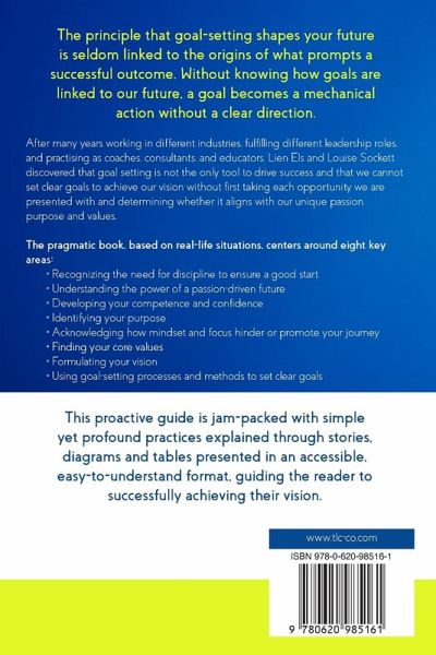 The principle that goal-setting shapes your future is seldom linked to the origins of what prompts a successful outcome. Without knowing how goals are linked to our future, a goal becomes a mechanical action without a clear direction. After many years working in different industries, fulfilling different leadership roles, and practising as coaches, consultants, and educators, Lien Els and Louise Sockett discovered that goal setting is not the only tool to drive success and that we cannot set clear goals to achieve our vision without first taking each opportunity we are presented with and determining whether it aligns with our unique passion, purpose and values. The pragmatic book, based on real-life situations, centers around eight key areas: Recognizing the need for discipline to ensure a good start Understanding the power of a passion-driven future Developing your competence and confidence Identifying your purpose Acknowledging how mindset and focus hinder or promote your journey Finding your core values Formulating your vision Using goal-setting processes and methods to set clear goals This proactive guide is jam-packed with simple yet profound practices explained through stories, diagrams and tables presented in an accessible, easy-to-understand format, guiding the reader to successfully achieving their vision.