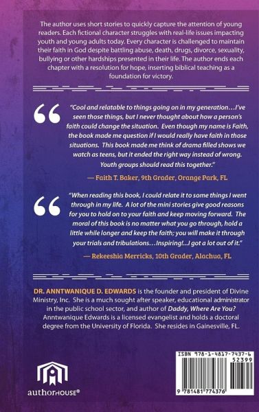 The author uses short stories to quickly capture the attention of young readers. Each fictional character struggles with real-life issues impacting youth and young adults today. Every character is challenged to maintain faith in God although they are in a battle with abuse, death, drugs, divorce, sexuality, school grades, bullying or other hardships presented in their life. The author ends each chapter with a resolution for hope, inserting biblical teaching as a foundation for victory. Several questions are posed at the end of the book to help youth leaders, Christian churches and other group facilitators guide discussions about each chapter.