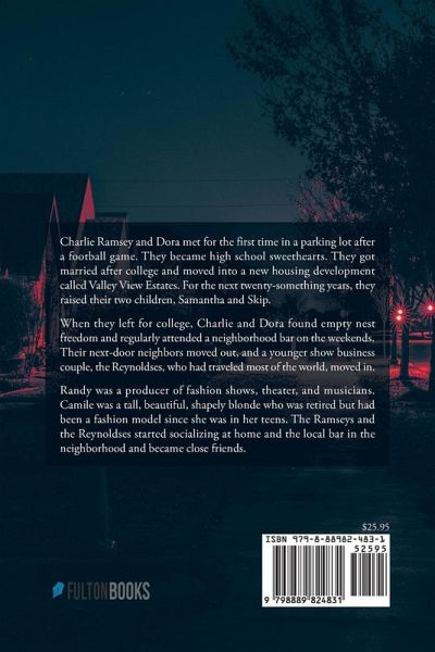 Charlie Ramsey and Dora met for the first time in a parking lot after a football game. They became high school sweethearts. They got married after college and moved into a new housing development called Valley View Estates. For the next twenty-something years, they raised their two children, Samantha and Skip. When they left for college, Charlie and Dora found empty nest freedom and regularly attended a neighborhood bar on the weekends. Their next-door neighbors moved out, and a younger show business couple, the Reynoldses, who had traveled most of the world, moved in. Randy was a producer of fashion shows, theater, and musicians. Camile was a tall, beautiful, shapely blonde who was retired but had been a fashion model since she was in her teens. The Ramseys and the Reynoldses started socializing at home and the local bar in the neighborhood and became close friends.