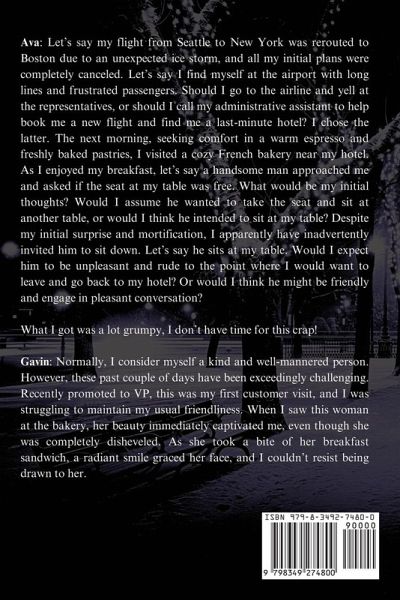 Ava: Let's say my flight from Seattle to New York was rerouted to Boston due to an unexpected ice storm, and all my initial plans were completely canceled. Let's say I find myself at the airport with long lines and frustrated passengers. Should I go to the airline and yell at the representatives, or should I call my administrative assistant to help book me a new flight and find me a last-minute hotel? I chose the latter. The next morning, seeking comfort in a warm espresso and freshly baked pastries, I visited a cozy French bakery near my hotel. As I enjoyed my breakfast, let's say a handsome man approached me and asked if the seat at my table was free. What would be my initial thoughts? Would I assume he wanted to take the seat and sit at another table, or would I think he intended to sit at my table? Despite my initial surprise and mortification, I apparently have inadvertently invited him to sit down. Let's say he sits at my table. Would I expect him to be unpleasant and rude to the point where I would want to leave and go back to my hotel? Or would I think he might be friendly and engage in pleasant conversation? What I got was a lot grumpy, I don't have time for this crap! Gavin: Normally, I consider myself a kind and well-mannered person. However, these past couple of days have been exceedingly challenging. Recently promoted to VP, this was my first customer visit, and I was struggling to maintain my usual friendliness. When I saw this woman at the bakery, her beauty immediately captivated me, even though she was completely disheveled. As she took a bite of her breakfast sandwich, a radiant smile graced her face, and I couldn't resist being drawn to her. So, I decided to take a seat at her table. Let's just say I wasn't the best version of myself.