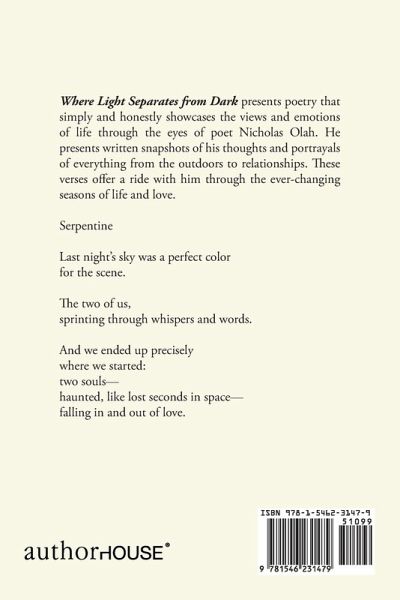 Where Light Separates from Dark presents poetry that simply and honestly showcases the views and emotions of life through the eyes of poet Nicholas Olah. He presents written snapshots of his thoughts and portrayals of everything from the outdoors to relationships. These verses offer a ride with him through the ever-changing seasons of life and love. Serpentine Last nights sky was a perfect color for the scene. The two of us, sprinting through whispers and words. And we ended up precisely where we started: two souls haunted, like lost seconds in space falling in and out of love.