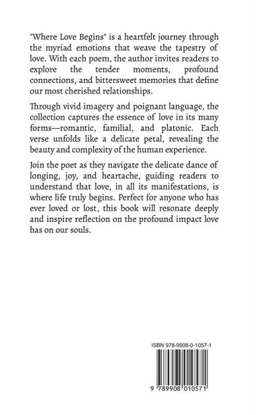 "Where Love Begins" is a heartfelt journey through the myriad emotions that weave the tapestry of love. With each poem, the author invites readers to explore the tender moments, profound connections, and bittersweet memories that define our most cherished relationships. Through vivid imagery and poignant language, the collection captures the essence of love in its many forms-romantic, familial, and platonic. Each verse unfolds like a delicate petal, revealing the beauty and complexity of the human experience. Join the poet as they navigate the delicate dance of longing, joy, and heartache, guiding readers to understand that love, in all its manifestations, is where life truly begins. Perfect for anyone who has ever loved or lost, this book will resonate deeply and inspire reflection on the profound impact love has on our souls.