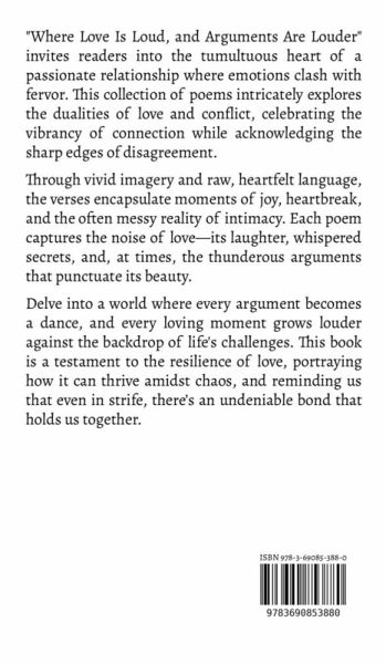 "Where Love Is Loud, and Arguments Are Louder" invites readers into the tumultuous heart of a passionate relationship where emotions clash with fervor. This collection of poems intricately explores the dualities of love and conflict, celebrating the vibrancy of connection while acknowledging the sharp edges of disagreement. Through vivid imagery and raw, heartfelt language, the verses encapsulate moments of joy, heartbreak, and the often messy reality of intimacy. Each poem captures the noise of love-its laughter, whispered secrets, and, at times, the thunderous arguments that punctuate its beauty. Delve into a world where every argument becomes a dance, and every loving moment grows louder against the backdrop of life's challenges. This book is a testament to the resilience of love, portraying how it can thrive amidst chaos, and reminding us that even in strife, there's an undeniable bond that holds us together.