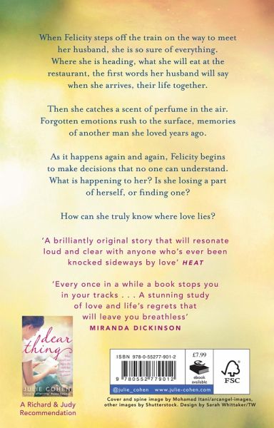A brilliantly original story that will resonate loud and clear with anyone who's ever been knocked sideways by love HEAT When Felicity steps off the train on the way to meet her husband she is so sure of everything. Where she is heading what she will eat at the restaurant the first words her husband will saywhen she arrives their life together. Then she catches a scent of perfume in the air. Forgotten emotions rush to the surface memoriesof another man she loved years ago. As it happens again and again Felicity beginsto make decisions that no one can understand. What is happening to her? Is she losing a partof herself or finding one? How can she truly know where love lies? Every once in a while a book stops you in your tracks . . . A stunning study of love and life's regrets that will leave you breathless MIRANDA DICKINSON
