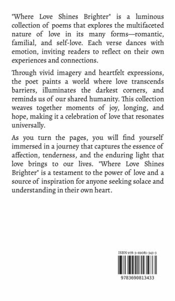 "Where Love Shines Brighter" is a luminous collection of poems that explores the multifaceted nature of love in its many forms-romantic, familial, and self-love. Each verse dances with emotion, inviting readers to reflect on their own experiences and connections. Through vivid imagery and heartfelt expressions, the poet paints a world where love transcends barriers, illuminates the darkest corners, and reminds us of our shared humanity. This collection weaves together moments of joy, longing, and hope, making it a celebration of love that resonates universally. As you turn the pages, you will find yourself immersed in a journey that captures the essence of affection, tenderness, and the enduring light that love brings to our lives. "Where Love Shines Brighter" is a testament to the power of love and a source of inspiration for anyone seeking solace and understanding in their own heart.