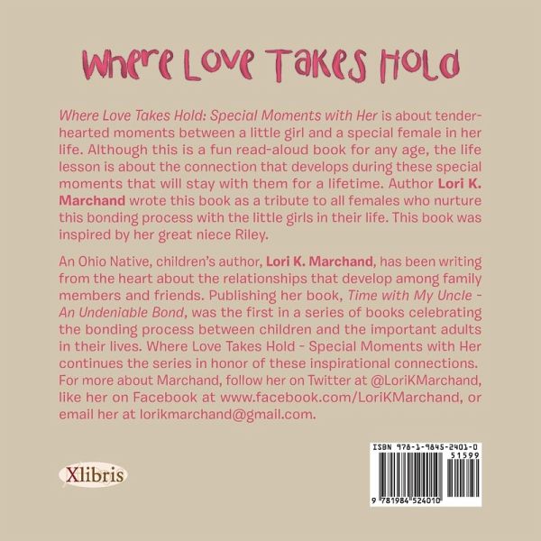 Where Love Takes Hold: Special Moments with Her is about tender-hearted moments between a little girl and a special female in her life. Although this is a fun read-aloud book for any age, the life lesson is about the connection that develops during these special moments that will stay with them for a lifetime. Author Lori K. Marchand wrote this book as a tribute to all females who nurture this bonding process with the little girls in their life. This book was inspired by her great niece Riley.