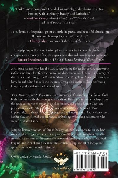 A weeping woman wanders the L.A. River, wailing for her lost son. A teen wants to find true love's kiss for their quince but discovers so much more. The journey of the last ahuizotl through the Franklin Mountains. King Triton's son finds a way to leave his tail behind to seek out the stars. Two girls become the keys to freeing long-trapped goddesses and their villages. Where Monsters Lurk & Magic Hides is an anthology of Latine/x genre fiction from both new and established young adult authors. The stories in this anthology span the genre categories of romance, sci-fi & fantasy, and gothic horror. They take place in this world, other worlds, or maybe somewhere in between. Most importantly, the characters on these pages are not stereotypical Latine characters. Rather, they are fleshed-out characters, embarking on amazing adventures, who are unabashedly Latine. Jumping between sections of this anthology, you will have a chance to see how tropes and settings specific to these genres are interpreted through our specific cultures. At the core of the stories are themes of family, love, religion, loss, food, longing, and ever-shifting identity. This anthology explores all of the joy and speculation found through Latinidad. Contributors: K.C. Amira, Carolina Florez-Cerchiaro, Jaelin St. Clair, Shayna Conde, K. Victoria Hernandez, Sabrina Prestes, Jarrard Raju, Kiara Medina, Ashley Jean Granillo, Mariel Jungkunz, Nathalie D. Medina, Judy Fernandez Diaz, Lauren T. Davila, Flor Salcedo, Stephanie Slagle, Alexandra Campos, Taylor Ramage, and Linda Raquel Nieves Pérez. Cover design by Mazziel Coello