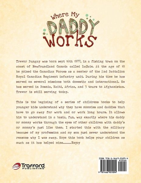 This is the begining of a series of childrens books to help younger kids understand why they have mommies and daddies that have to go away for work and or work long hours. It allows him to understand in a basic, fun, way exactly where his daddy or mommy works through the eyes of other children with daddy's or mommy's just like them. I started this with the military because of my profession and my son just never understood the reasons why I was away. Hope this book helps your children as much as it has helped mine........Enjoy