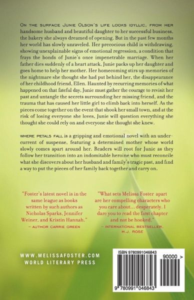 On the surface Junie Olson's life looks idyllic, from her handsome husband and beautiful daughter to her successful business, the bakery she'd always dreamed of opening. But in the past few months her world has slowly unraveled. Her precocious child is withdrawing, showing unexplainable signs of emotional regression, a condition that frays the bonds of Junie's once impenetrable marriage. When her father dies suddenly of a heart attack, Junie packs up her daughter and goes home to help her mother. Her homecoming stirs up memories of the nightmare she thought she had put behind her, the disappearance of her childhood friend, Ellen. Haunted by recurring memories of what happened on that fateful day, Junie must gather the courage to revisit her past and untangle the secrets surrounding her missing friend, and the trauma that has caused her little girl to climb back into herself. As the pieces come together on the event that shook her small town, and at the risk of losing everyone she loves, Junie will question everything she thought she could rely on and everyone she thought she knew. WHERE PETALS FALL is a gripping and emotional novel with an undercurrent of suspense, featuring a determined mother whose world slowly comes apart around her. Readers will root for Junie as they follow her transition into an indomitable heroine who must reconcile what she discovers about her husband and family's tragic past, and find a way to put the pieces of her family back together and carry on.