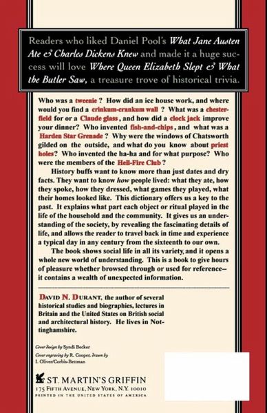 Who was a tweenie? How did an ice house work and where would you find a crinkum-crankum wall? What was a chesterfield for, or a Claude glass, and how did a clock jack improve your dinner? The answers to these and many other questions appear in this dictionary, which is a feast of information and trivia for history buffs everywhere wanting to know more than just dates and dry facts. They want to know how people lived: what they ate, how they spoke, how they dressed, what games they played, what their homes looked like. This unique dictionary reveals the fascinating details of life, allowing the reader to travel back in time and experience a typical day in any century from the sixteenth to our own. A book to give hours of pleasure whether browsed through or used for reference-it contains a wealth of unexpected information.
