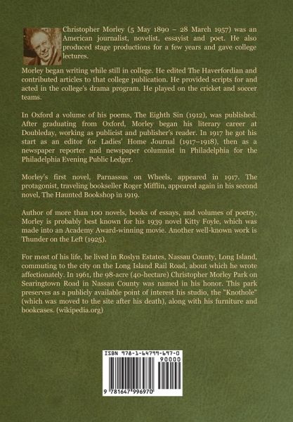 Christopher Morley (5 May 1890 - 28 March 1957) was an American journalist, novelist, essayist and poet. He also produced stage productions for a few years and gave college lectures. Morley began writing while still in college. He edited The Haverfordian and contributed articles to that college publication. He provided scripts for and acted in the college's drama program. He played on the cricket and soccer teams. In Oxford a volume of his poems, The Eighth Sin (1912), was published. After graduating from Oxford, Morley began his literary career at Doubleday, working as publicist and publisher's reader. In 1917 he got his start as an editor for Ladies' Home Journal (1917-1918), then as a newspaper reporter and newspaper columnist in Philadelphia for the Philadelphia Evening Public Ledger. Morley's first novel, Parnassus on Wheels, appeared in 1917. The protagonist, traveling bookseller Roger Mifflin, appeared again in his second novel, The Haunted Bookshop in 1919. He was one of the founders and a longtime contributing editor of the Saturday Review of Literature. A highly gregarious man, he was the mainstay of what he dubbed the "Three Hours for Lunch Club". Out of enthusiasm for the Sherlock Holmes stories, he helped found The Baker Street Irregulars and wrote the introduction to the standard omnibus edition of The Complete Sherlock Holmes. He also wrote an introduction to the standard omnibus edition of The Complete Works of Shakespeare in 1936, although Morley called it an "Introduction to Yourself as a Reader of Shakespeare". That year, he was appointed to revise and enlarge Bartlett's Familiar Quotations (11th edition in 1937 and 12th edition in 1948). He was one of the first judges for the Book of the Month Club, serving in that position until the early 1950s. Author of more than 100 novels, books of essays, and volumes of poetry, Morley is probably best known for his 1939 novel Kitty Foyle, which was made into an Academy Award-winning movie. Another well-known work is Thunder on the Left (1925). For most of his life, he lived in Roslyn Estates, Nassau County, Long Island, commuting to the city on the Long Island Rail Road, about which he wrote affectionately. In 1961, the 98-acre (40-hectare) Christopher Morley Park on Searingtown Road in Nassau County was named in his honor. This park preserves as a publicly available point of interest his studio, the "Knothole" (which was moved to the site after his death), along with his furniture and bookcases. (wikipedia.org)