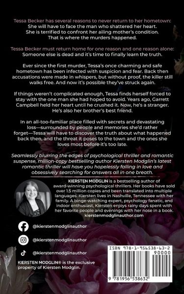 Tessa Becker has several reasons to never return to her hometown: She will have to face the man who shattered her heart. She is terrified to confront her ailing mother's condition. That is where the murders happened. Tessa Becker must return home for one reason and one reason alone: Someone else is dead and it's time to finally learn the truth. Ever since the first murder, Tessa's once charming and safe hometown has been infected with suspicion and fear. Back then accusations were made in whispers, but without proof, the killer still walks free. And now it's possible they've struck again. If things weren't complicated enough, Tessa finds herself forced to stay with the one man she had hoped to avoid. Years ago, Garrett Campbell held her heart until he crushed it. Now, he's a stranger. He's also her brother's best friend. In an all-too-familiar place filled with secrets and devastating loss-surrounded by people and memories she'd rather forget-Tessa will have to discover the truth about what happened back then, and the threat it poses to the town and the ones she loves most before it's too late. Seamlessly blurring the edges of psychological thriller and romantic suspense, million-copy bestselling author Kiersten Modglin's latest romantic thriller will have you hopelessly falling in love and obsessively searching for answers all in one breath.