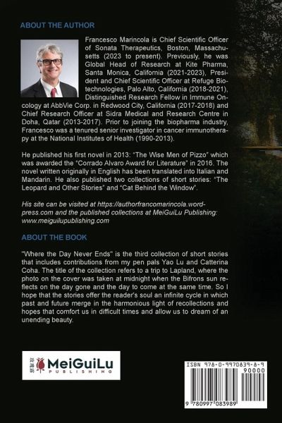 ABOUT THE BOOK "Where the Day Never Ends" is the third collection of short stories that includes contributions from my pen pals Yao Lu and Catterina Coha. The title of the collection refers to a trip to Lapland, where the photo on the cover was taken at midnight when the Bifrons sun reflects on the day gone and the day to come at the same time. So I hope that the stories offer the reader's soul an infinite cycle in which past and future merge in the harmonious light of recollections and hopes that comfort us in difficult times and allow us to dream of an unending beauty.