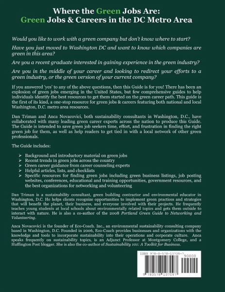 Would you like to work with a green company but don't know where to start? Have you just moved to Washington DC and want to know which companies are green in this area? Are you a recent graduate interested in gaining experience in the green industry? Are you in the middle of your career and looking to redirect your efforts to a green industry, or the green version of your current company? If you answered 'yes' to any of the above questions, then this Guide is for you! There has been an explosion of green jobs emerging in the United States, but few comprehensive guides to help individuals identify the best resources to get them started on the green career path. This guide is the first of its kind, a one-stop resource for green jobs & careers featuring both national and local Washington, D.C. metro area resources.