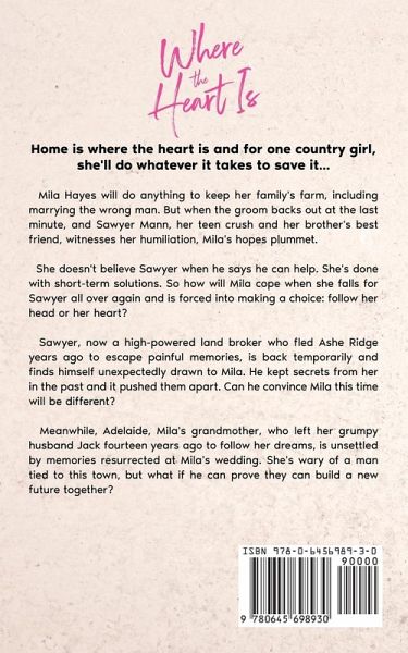 Home is where the heart is and for one country girl, she'll do whatever it takes to save it... Mila Hayes will do anything to keep her family's farm, including marrying the wrong man. But when the groom backs out at the last minute, and Sawyer Mann, her teen crush and her brother's best friend, witnesses her humiliation, Mila's hopes plummet. She doesn't believe Sawyer when he says he can help. She's done with short-term solutions. So how will Mila cope when she falls for Sawyer all over again and is forced into making a choice: follow her head or her heart? Sawyer, now a high-powered land broker who fled Ashe Ridge years ago to escape painful memories, is back temporarily and finds himself unexpectedly drawn to Mila. He kept secrets from her in the past and it pushed them apart. Can he convince Mila this time will be different? Meanwhile, Adelaide, Mila's grandmother, who left her grumpy husband Jack fourteen years ago to follow her dreams, is unsettled by memories resurrected at Mila's wedding. She's wary of a man tied to this town, but what if he can prove they can build a new future together?