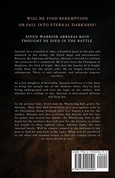 Will he find redemption or fall into eternal darkness? Elven warrior Abraxas Kain thought he died in the battle. Instead, he's stranded in time, a hundred years in the past and enslaved to his enemy, the blood mage and necromancer, Nerezza. Re-fighting old battles, Abraxas is forced to confront the atrocities he's committed. He'd once been the Champion of Haphion, the God of Light. But had the battles he'd fought really been for the moral side? He no longer believes in redemption. There is only salvation, and salvation requires sacrifice. As a lost daughter of Serevadia, Nerezza believes it's her duty to bring her people out of the shadows where they've been living underground and into the light on the surface. And whether he's willing or not, Nerezza is determined Abraxas will help her. In the present time, Evren and the Wandering Sols grieve for Abraxas. Then they find themselves in a race against time as the Serevadian threat beneath their feet begins a war for the surface. Nerezza was once a friend, but destiny and her lust for power has turned her against the Wandering Sols as she hunts for the artifacts that will give her the divinity to return her people to their rightful place. Abraxas fights his own internal battle. Will he remain trapped in the darkness of the past or find his way back to the light? What will be sacrificed as old allies and enemies return to face the coming threat of an entire world at war?