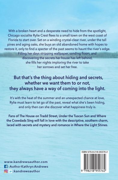 With a broken heart and a desperate need to hide from the spotlight, Chicago socialite Rylie Crest flees to a small town on the west coast of Florida to start over. Set on a winding crystal-clear river, under the tall pines and aging oaks, she buys an old abandoned home with hopes to restore it, only to find a specter of the past seems to haunt the river's edge. Filling her days stripping wallpaper, sanding floors, and discovering the secrets her house has left behind, she fills her nights imploring the river to take her sorrows and set her free. But that's the thing about hiding and secrets, whether we want them to or not, they always have a way of coming into the light. It's with the heat of the summer and an unexpected chance at love, Rylie must learn to let go of the past, reveal what she's been hiding, and only then can she discover what happiness truly is. Fans of The House on Tradd Street, Under the Tuscan Sun and Where the Crawdads Sing will fall in love with the descriptive, southern charm, laced with secrets and mystery and romance in Where the Light Shines.