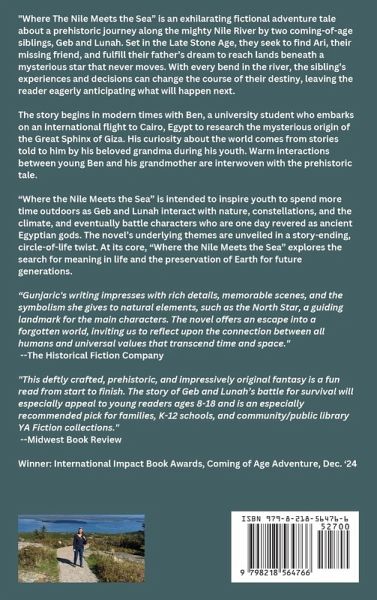 "Where The Nile Meets the Sea" is an exhilarating fictional adventure tale about a prehistoric journey along the mighty Nile River by two coming-of-age siblings, Geb and Lunah. Set in the Late Stone Age, they seek to find Ari, their missing friend, and fulfill their father's dream to reach lands beneath a mysterious star that never moves. With every bend in the river, the sibling's experiences and decisions can change the course of their destiny, leaving the reader eagerly anticipating what will happen next. The story begins in modern times with Ben, a university student who embarks on an international flight to Cairo, Egypt to research the mysterious origin of the Great Sphinx of Giza. His curiosity about the world comes from stories told to him by his beloved grandma during his youth. Warm interactions between young Ben and his grandmother are interwoven with the prehistoric tale. "Where the Nile Meets the Sea" is intended to inspire youth to spend more time outdoors as Geb and Lunah interact with nature, constellations, and the climate, and eventually battle characters who are one day revered as ancient Egyptian gods. The novel's underlying themes are unveiled in a story-ending, circle-of-life twist. At its core, "Where the Nile Meets the Sea" explores the search for meaning in life and the preservation of Earth for future generations. "Gunjaric's writing impresses with rich details, memorable scenes, and the symbolism she gives to natural elements, such as the North Star, a guiding landmark for the main characters. The novel offers an escape into a forgotten world, inviting us to reflect upon the connection between all humans and universal values that transcend time and space." --The Historical Fiction Company "This deftly crafted, prehistoric, and impressively original fantasy is a fun read from start to finish. The story of Geb and Lunah's battle for survival will especially appeal to young readers ages 8-18 and is an especially recommended pick for families, K-12 schools, and community/public library YA Fiction collections." --Midwest Book Review If you enjoy this novel, consider supporting Tree Aid, an international NGO supporting communities to tackle poverty and the climate crisis through the power of trees. Their projects support the Great Green Wall initiative.Winner: International Impact Book Awards, Category: Coming of Age Adventure, December 2024