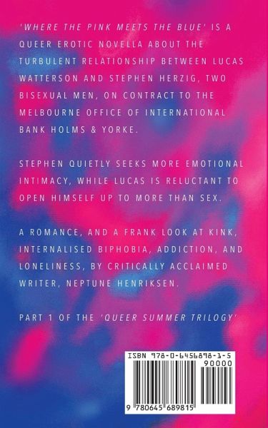 'Where The Pink Meets The Blue' is a queer erotic novella about the turbulent relationship between Lucas and Stephen, two bisexual men, on contract to the Melbourne office of international bank Holms & Yorke. Initially, the pair begin their BDSM rendezvous in secret, with Stephen quietly seeking a more open relationship, and Lucas being reluctant to open himself up to more than sex. In this debut novella, critically acclaimed writer, Neptune Henriksen, explores bisexuality, emotional intimacy, and vulnerability through a sexual relationship of circumstance. Part 1 of the Queer Summer Trilogy