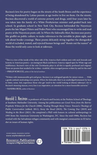 Recinos's love for poetry began on the streets of the South Bronx and the experience of being abandoned by Latino parents at age twelve to live on them. On the streets, Recinos discovered a world of extreme poverty and drugs, until four years later he was taken into the family of a White Presbyterian minister and guided back into school. In graduate school in New York City, Recinos befriended the Nuyorican poets the late Miguel Pinero and Pedro Pietri who encouraged him to write and read poetry at the Nuyorican poets cafe. In Where the Sidewalks Meet, Recinos uses poetry like graffiti on…mehr