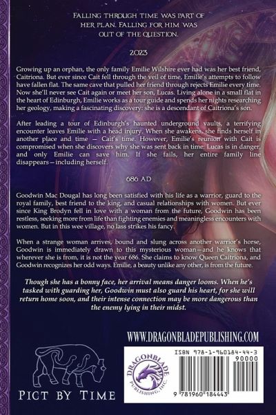 Falling through time was part of her plan. Falling for him was out of the question. 2023 Growing up an orphan, the only family Emilie Wilshire ever had was her best friend, Caitriona. But ever since Cait fell through the veil of time, Emilie's attempts to follow have fallen flat. The same cave that pulled her friend through rejects Emilie every time. Now she'll never see Cait again or meet her son, Lucas. Living alone in a small flat in the heart of Edinburgh, Emilie works as a tour guide and spends her nights researching her geology, making a fascinating discovery: she is a descendant of Caitriona's son. After leading a tour of Edinburgh's haunted underground vaults, a terrifying encounter leaves Emilie with a head injury. When she awakens, she finds herself in another place and time - Cait's time. However, Emilie's reunion with Cait is compromised when she discovers why she was sent back in time: Lucas is in danger, and only Emilie can save him. If she fails, her entire family line disappears-including herself. 686 AD Goodwin Mac Dougal has long been satisfied with his life as a warrior, guard to the royal family, best friend to the king, and casual relationships with women. But ever since King Brodyn fell in love with a woman from the future, Goodwin has been restless, seeking more from life than fighting enemies and meaningless encounters with women. But in this wee village, no lass strikes his fancy. When a strange woman arrives, bound and slung across another warrior's horse, Goodwin is immediately drawn to this mysterious woman-and he knows that wherever she is from, it is not the year 686. She claims to know Queen Caitriona, and Goodwin recognizes her odd ways. Emilie, a beauty unlike any other, is from the future. Though she has a bonny face, her arrival means danger looms. When he's tasked with guarding her, Goodwin must also guard his heart, for she will return home soon, and their intense connection may be more dangerous than the enemy lying in their midst. Pict by Time Where the Thistle Grows Where the Stars Lead Where the Ocean Ends