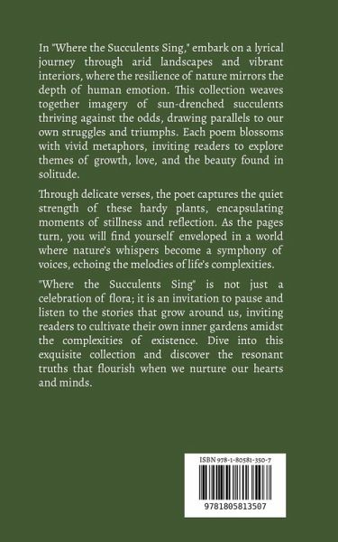 In "Where the Succulents Sing," embark on a lyrical journey through arid landscapes and vibrant interiors, where the resilience of nature mirrors the depth of human emotion. This collection weaves together imagery of sun-drenched succulents thriving against the odds, drawing parallels to our own struggles and triumphs. Each poem blossoms with vivid metaphors, inviting readers to explore themes of growth, love, and the beauty found in solitude. Through delicate verses, the poet captures the quiet strength of these hardy plants, encapsulating moments of stillness and reflection. As the pages turn, you will find yourself enveloped in a world where nature's whispers become a symphony of voices, echoing the melodies of life's complexities. "Where the Succulents Sing" is not just a celebration of flora; it is an invitation to pause and listen to the stories that grow around us, inviting readers to cultivate their own inner gardens amidst the complexities of existence. Dive into this exquisite collection and discover the resonant truths that flourish when we nurture our hearts and minds.