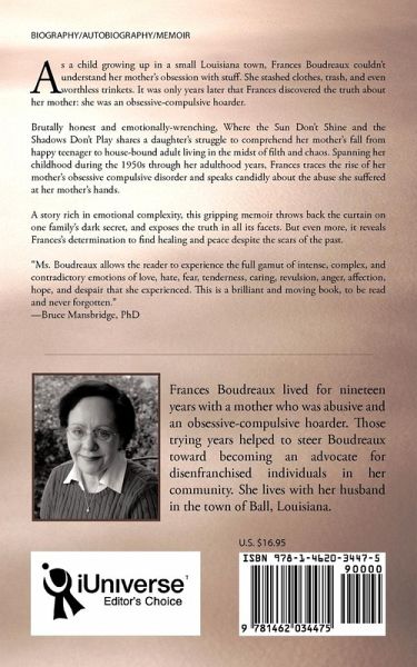 As a child growing up in a small Louisiana town, Frances Boudreaux couldn't understand her mother's obsession with stuff. She stashed clothes, trash, and even worthless trinkets. It was only years later that Frances discovered the truth about her mother: she was an obsessive-compulsive hoarder. Brutally honest and emotionally-wrenching, Where the Sun Don't Shine and the Shadows Don't Play shares a daughter's struggle to comprehend her mother's fall from happy teenager to house-bound adult living in the midst of filth and chaos. Spanning her childhood during the 1950s through her adulthood years, Frances traces the rise of her mother's obsessive compulsive disorder and speaks candidly about the abuse she suffered at her mother's hands. A story rich in emotional complexity, this gripping memoir throws back the curtain on one family's dark secret, and exposes the truth in all its facets. But even more, it reveals Frances's determination to find healing and peace despite the scars of the past. "Ms. Boudreaux allows the reader to experience the full gamut of intense, complex, and contradictory emotions of love, hate, fear, tenderness, caring, revulsion, anger, affection, hope, and despair that she experienced. This is a brilliant and moving book, to be read and never forgotten." -Bruce Mansbridge, PhD
