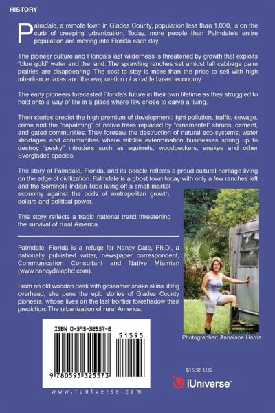 Palmdale, a remote town in Glades County, population less than 1,000, is on the curb of creeping urbanization. Today, more people than Palmdale's entire population are moving into Florida each day. The pioneer culture and Florida's last wilderness is threatened by growth that exploits "blue gold" water and the land. The sprawling ranches set amidst tall cabbage palm prairies are disappearing. The cost to stay is more than the price to sell with high inheritance taxes and the evaporation of a cattle based economy. The early pioneers forecasted Florida's future in their own lifetime as they struggled to hold onto a way of life in a place where few chose to carve a living. Their stories predict the high premium of development: light pollution, traffic, sewage, crime and the "napalming" of native trees replaced by "ornamental" shrubs, cement, and gated communities. They foresaw the destruction of natural eco-systems, water shortages and communities where wildlife extermination businesses spring up to destroy "pesky" intruders such as squirrels, woodpeckers, snakes and other Everglades species. The story of Palmdale, Florida, and its people reflects a proud cultural heritage living on the edge of civilization. Palmdale is a ghost town today with only a few ranches left and the Seminole Indian Tribe living off a small market economy against the odds of metropolitan growth, dollars and political power. This story reflects a tragic national trend threatening the survival of rural America.