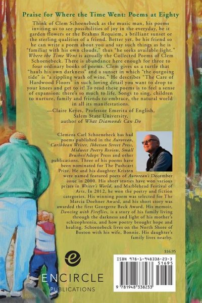 Think of Clem Schoenebeck as the music man, his poems inviting us to see possibilities of joy in the everyday, be it garden flowers or the Brahms Requiem, a brilliant sunset or the sterling qualities of a friend. Better yet, be his friend so he can write a poem about you and say such things as he is "familiar with his own clouds," thus "he seeks available light." Where the Time Went is actually the Collected Poems of Clem Schoenebeck. There is abundance here enough for three to four ordinary books of poems. Clem gives us a turtle that "hauls his own darkness" and a sunset in which "the outgoing tide" is "a rippling wash of wine." He describes "The Care of Hardwood Floors" in such loving detail you want to drop to your knees and get to it! To read these poems is to feel a sense of expansion: there's so much to life. Songs to sing, children to nurture, family and friends to embrace, the natural world in all its manifestations. -Claire Keyes, Professor Emerita of English, Salem State University, author of What Diamonds Can Do Reading the poems in Where the Time Went, I can think of no greater tribute than for Clemens Carl Schoenebeck to be called a "priest of the invisible" as Wallace Stevens might say. Witness "Alles in Ordnug," for example, where sons are reassuring their father as he takes his final breaths that "everything is fine...." This tercet's summation, "And the darkness knows everything," is the poet's ineluctable refrain of a sublime liturgy. I am especially drawn to the "FAMILY" selection, exemplified by the starkly memorable "Vespers" in which the poet, as a boy, recalls accompanying his father to the state hospital for the mentally ill "to visit my mother in her Purgatorial Home." The lines are sung by the poet who understands that only the passage of time instructs the catechism of one's heart. There are poems in Where the Time Went that will linger in your consciousness long after being read...and some will never leave. -Dennis Must, author of several story collections and novels including the forthcoming Brother Carnival