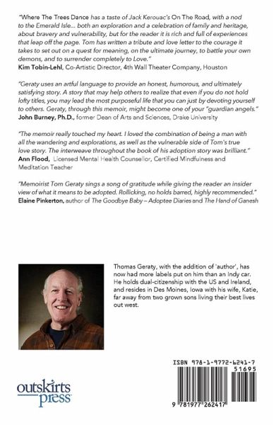 "Where The Trees Dance has a taste of Jack Kerouac's On The Road, with a nod to the Emerald Isle... both an exploration and a celebration of family and heritage, about bravery and vulnerability, but for the reader it is rich and full of experiences that leap off the page. Tom has written a tribute and love letter to the courage it takes to set out on a quest for meaning, on the ultimate journey, to battle your own demons, and to surrender completely to Love." ~ Kim Tobin-Lehl, Co-Artistic Director, 4th Wall Theater Company, Houston "Geraty uses an artful language to provide an honest, humorous, and ultimately satisfying story. A story that may help others to realize that even if you do not hold lofty titles, you may lead the most purposeful life that you can just by devoting yourself to others. Geraty, through this memoir, might become one of your "guardian angels." ~ John Burney, Ph.D., former Dean of Arts and Sciences, Drake University "The memoir really touched my heart. I loved the combination of being a man with all the wandering and explorations, as well as the vulnerable side of Tom's true love story. The interweave throughout the book of his adoption story was brilliant." ~ Ann Flood, Licensed Mental Health Counsellor, Certified Mindfulness and Meditation Teacher "Memoirist Tom Geraty sings a song of gratitude while giving the reader an insider view of what it means to be adopted. Rollicking, no holds barred, highly recommended." ~ Elaine Pinkerton, author of The Goodbye Baby - Adoptee Diaries and The Hand of Ganesh