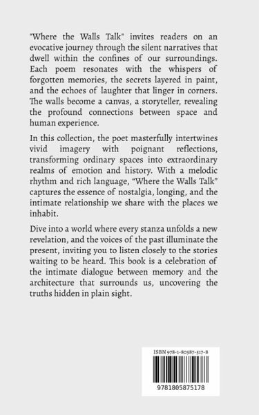 "Where the Walls Talk" invites readers on an evocative journey through the silent narratives that dwell within the confines of our surroundings. Each poem resonates with the whispers of forgotten memories, the secrets layered in paint, and the echoes of laughter that linger in corners. The walls become a canvas, a storyteller, revealing the profound connections between space and human experience. In this collection, the poet masterfully intertwines vivid imagery with poignant reflections, transforming ordinary spaces into extraordinary realms of emotion and history. With a melodic rhythm and rich language, "Where the Walls Talk" captures the essence of nostalgia, longing, and the intimate relationship we share with the places we inhabit. Dive into a world where every stanza unfolds a new revelation, and the voices of the past illuminate the present, inviting you to listen closely to the stories waiting to be heard. This book is a celebration of the intimate dialogue between memory and the architecture that surrounds us, uncovering the truths hidden in plain sight.