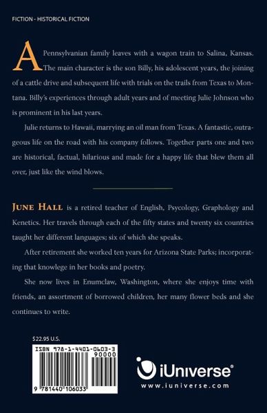 A Pennsylvanian family leaves with a wagon train to Salina, Kansas. The main character is the son Billy, his adolescent years, the joining of a cattle drive and subsequent life with trials on the trails from Texas to Montana. Billy's experiences through adult years and of meeting Julie Johnson who is prominent in his last years. Julie returns to Hawaii, marrying an oil man from Texas. A fantastic, outrageous life on the road with his company follows. Together parts one and two are historical, factual, hilarious and made for a happy life that blew them all over, just like the wind blows.