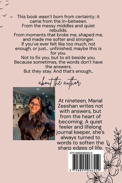 This is not a book about having all the answers. It's about sitting with the questions. It's about the heartbreak of growing up and the grace of growing into. About starting even when you don't feel ready, resting when the world says run, and finding softness in a world that calls it weakness. Through seventeen honest chapters, Manal invites you into a space where being lost isn't wrong, and being real is enough. With gentle truths and raw reflections, she captures what it feels like to navigate life when you're not quite a child, not yet an adult, but entirely human. Because sometimes, healing begins not with a solution... But with a sentence.