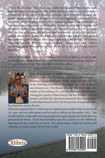 Where Theres Hope - Theres Love is a collection of poems that inspire with hope for today and tomorrow. The author shares poems of hope for brighter tomorrows. In the poems A Rainbow of Hope and Over the Horizon, the author expresses that even through the most challenging of times in ones life, tomorrow will be brighter. In the poem Gathering Stones, the author shares that there comes a period in our lives when we experience disappointments and we gather stones, in search for inner peace through healing and forgiveness. Also, in this collection, the author, who is a mother of an adult son with autism, shares three poems about autism to help bring a better awareness and understanding about autism, which is so expressed in her poems Do You See Him? Do You Hear Him? Do You Know Him? Tears, and John. And in the closing poem, Beyond the Sunset, the author shares that we can come to know love. Where Theres Hope - Theres Love inspires us to believe that on any given day, we always have hope to hold on to and our faith to keep us going, and above all, as we come to know love, we will live our best selves.