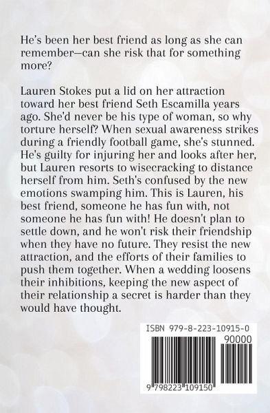 He's been her best friend as long as she can remember-can she risk that for something more? Lauren Stokes put a lid on her attraction toward her best friend Seth Escamilla years ago. She'd never be his type of woman, so why torture herself? When sexual awareness strikes during a friendly football game, she's stunned. He's guilty for injuring her and looks after her, but Lauren resorts to wisecracking to distance herself from him. Seth's confused by the new emotions swamping him. This is Lauren, his best friend, someone he has fun with, not someone he has fun with! He doesn't plan to settle down, and he won't risk their friendship when they have no future. They resist the new attraction, and the efforts of their families to push them together. When a wedding loosens their inhibitions, keeping the new aspect of their relationship a secret is harder than they would have thought.